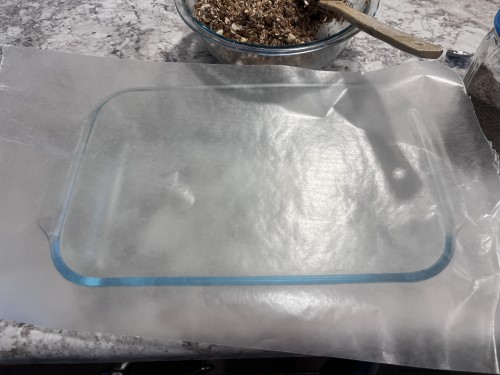 Spread the mixture into the pan, using your hands if you need to in order to make the mixture go all the way up to the sides. Then cover and place in the refrigerator for at least an hour.