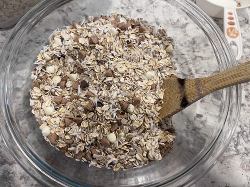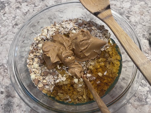 - Put the oats, coconut, flaxseed, and chocolate chips in a bowl and stir. Add the peanut butter, honey, and vanilla and stir with a wooden spoon.
