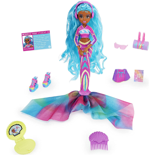 - DELUXE MERMAID TOY FASHION DOLL: Oceanna is splasin’ for fashion! This detailed 10.5-inch poseable mermaid doll figure includes a premium fabric tail, a matching top and skirt, sneakers and 4 accessories!
