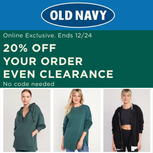Hop over to Old Navy and get 20% Off Your Order, Even Clearance! Grab some new clothes and accessories for your family at Old Navy for the coming new year! Choose free in-store pickup to avoid and shipping costs.