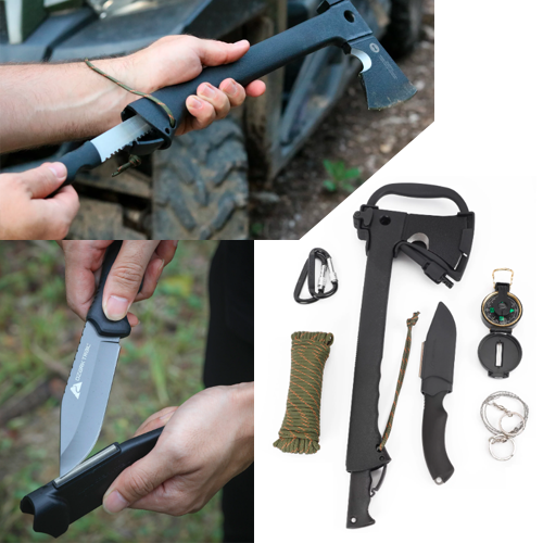 - Includes: hatchet with sheath, magnesium fire rod, whistle, fixed blade knife with sheath, 2 carabiners, compass, compass, paracord, chainsaw