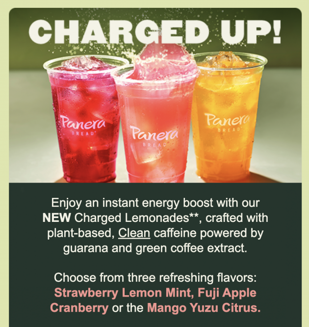 Up until this month, you could only choose from iced/hot coffee or hot tea. But now it includes just about every drink available at Panera! Choose from iced/hot coffee, hot tea, specialty iced teas, fountain drinks, lemonade, and even their brand new Charged Lemonades!