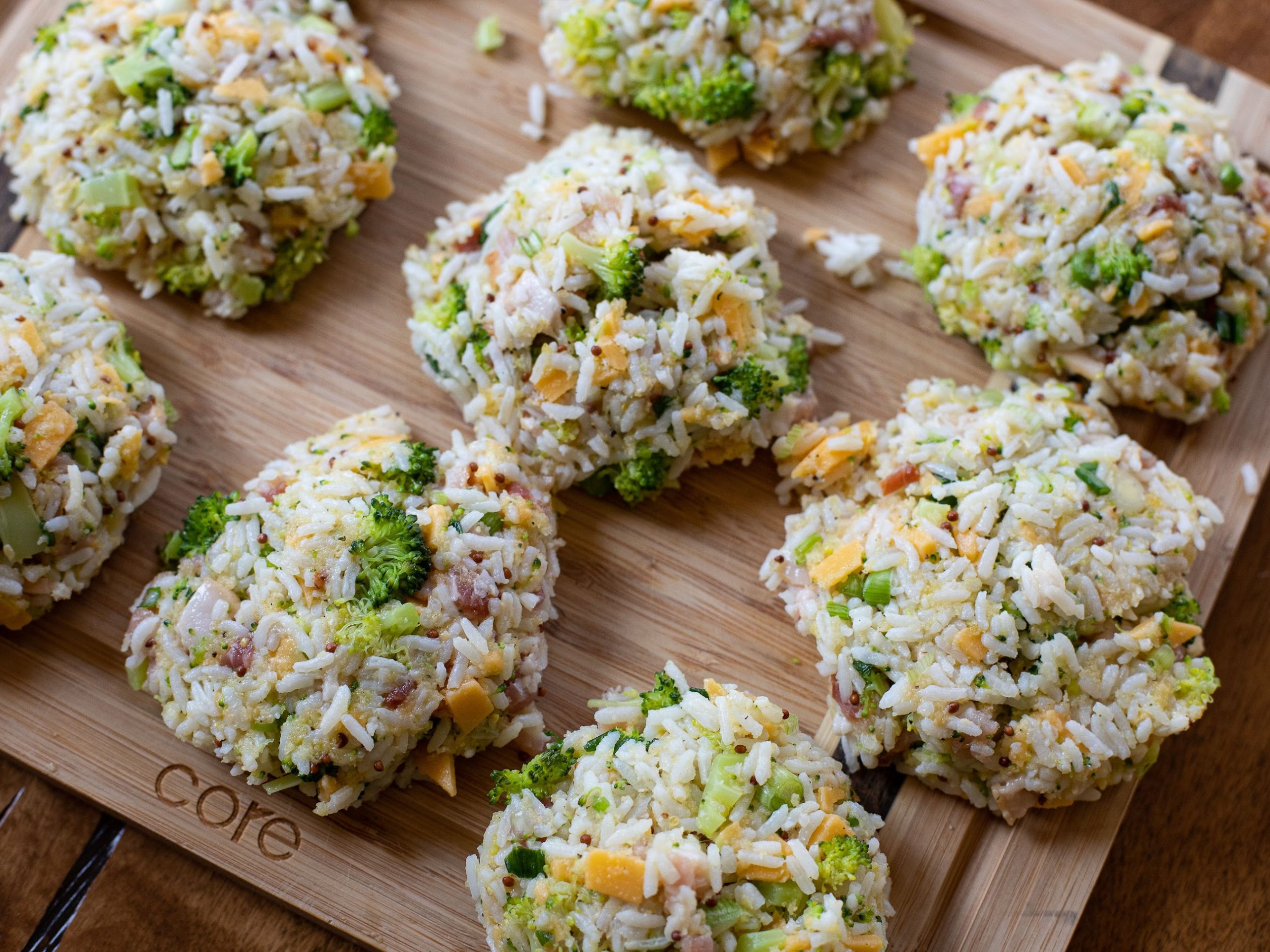 Whenever I have leftover rice, my go-to recipe is always a batch of delicious rice cakes. You can throw in any cheese or veggie and you’ll have a great way to make use of any extra food you might have handy. One of our favorite versions are those delicious Broccoli, Cheddar and Bacon Rice Cakes using Hatfield Bacon that you see above. A few basic ingredients come together for a hearty and flavorful dish that is sure to please.