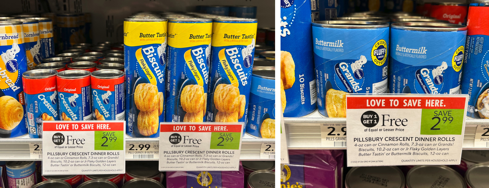 Pillsbury Crescent Dinner Rolls, 4 oz can, Cinnamon Rolls With Icing, 7.3 oz can, or Grands! Biscuits, 10.2 oz can, or Jr Flaky Biscuits, 12 oz, BOGO $2.99