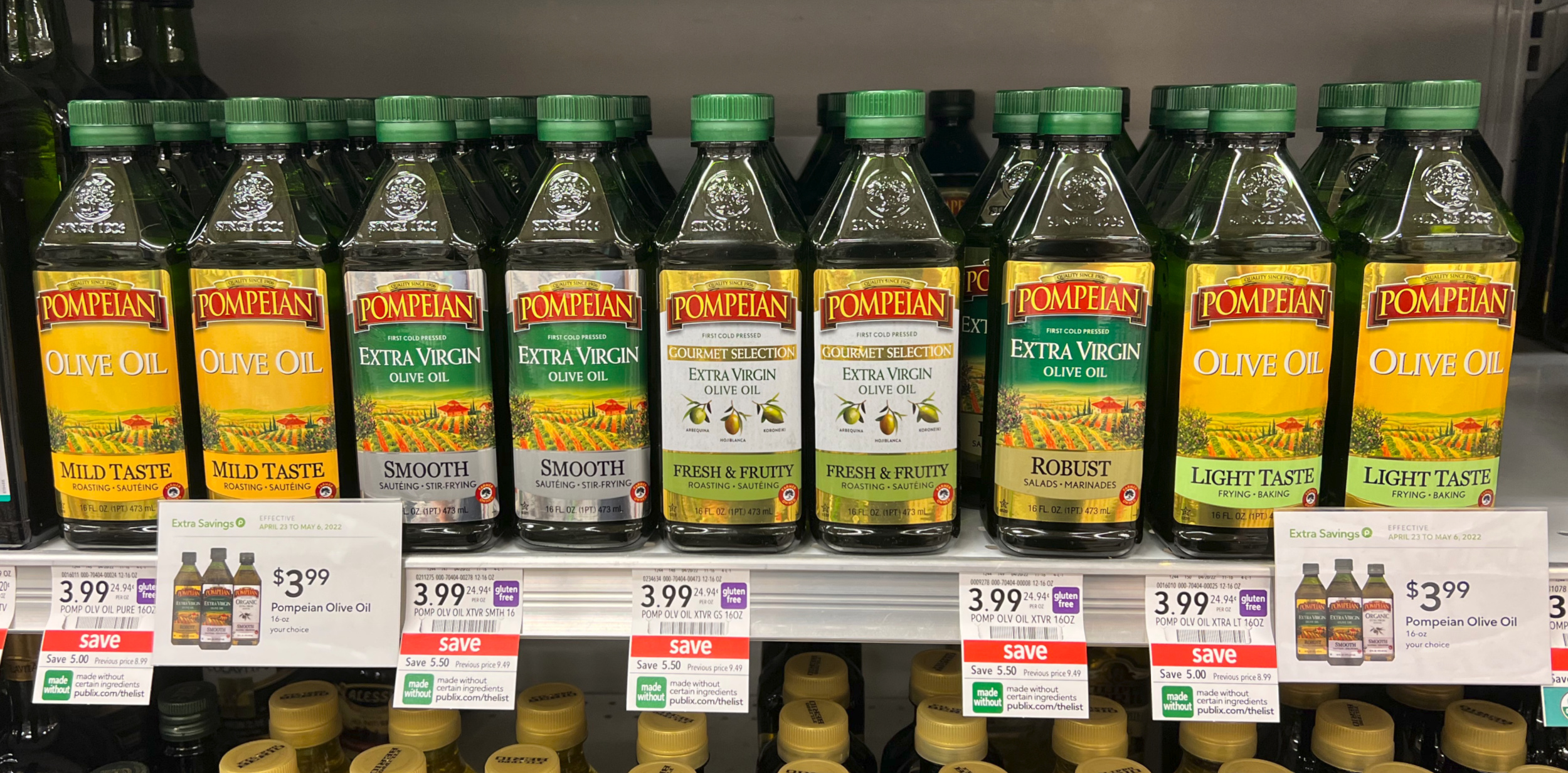 Grab a nice deal on Pompeian Olive Oil at Publix right now. The bottles are on sale in the current Extra Savings Flyer! You pay just $3.99 for a bottle—no coupon needed! That is way better than the original price of $9.49! Just hurry as the sale ends tomorrow!