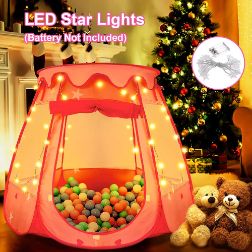 • This girls toys tent comes with colorful LED star lights, kids ball pit, mesh windows, removable skylights and doors with roller shutters. Princess tent creates a dreamlike playhouse for kids, which is improves children’s imagination, creativity and practical ability.