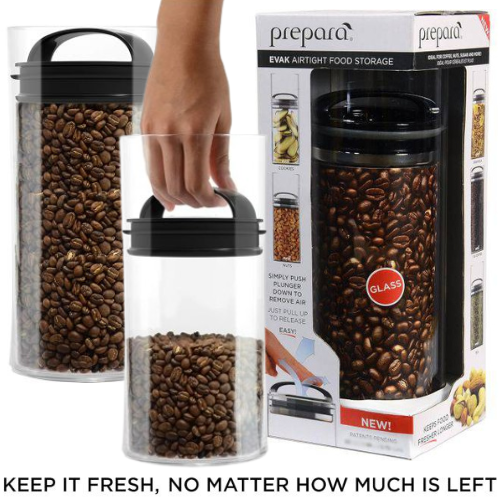 • GREAT LOOKING PRODUCT. Crystal clear and solidly built, the Evak stores conveniently and looks great on any counter or pantry, a beautiful complement to most kitchen décor. The Evak has now won 4 Internationally recognized awards for its cosmetic design and its practical functionality.