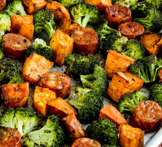 Roasted Sweet Potatoes, Sausage & Broccoli Sheet Pan