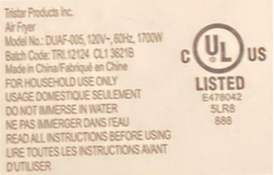 - Verify that your air fryer is one of the affected by checking the rating label (pictured above) on the bottom of the air fryer.