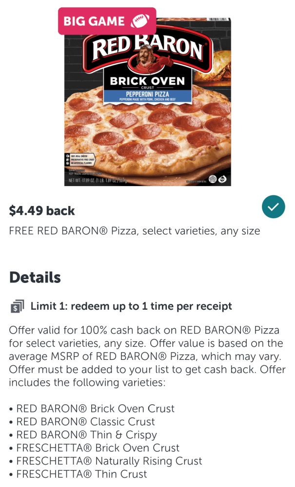 Joaquin emailed with a great deal. Load your cash back offer and snag a super deal on Red Baron Pizzas. With the cash back you can get your favorite variety for FREE the next time you shop.