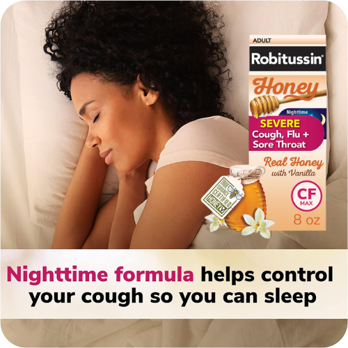 - Robitussin Honey Severe Cough, Flu & Sore Throat Nighttime Max Syrup helps calm cough and cold or flu symptoms