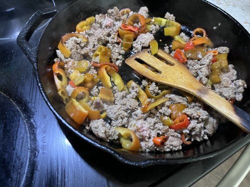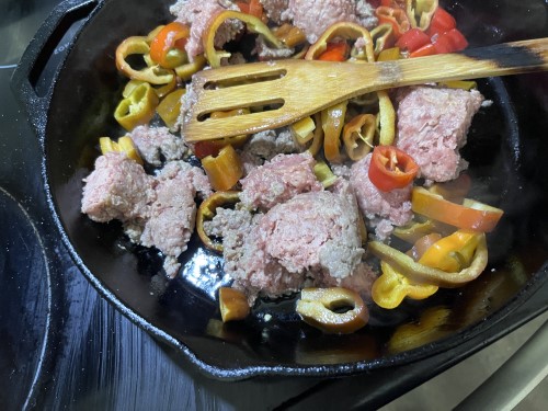 - Chop up peppers and cook with sausage until sausage is browned and peppers are softened.
