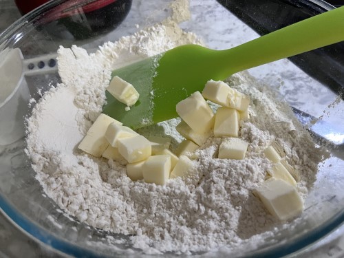 - Mix flour, baking power and salt in a bowl. Add in 6 tbsp. cubed, cold butter.
