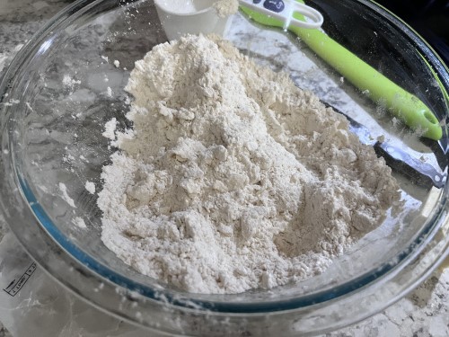 I usually end up using my hands to mix the butter into the flour. You want as much of the flour to be touching butter as possible. Then, pour in the 1 cup of milk.