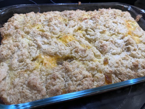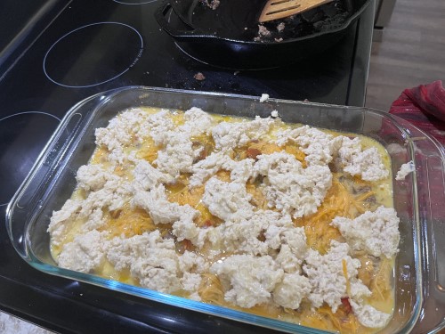 - Pour egg mixture over top and then drop biscuit dough in blobs on top.