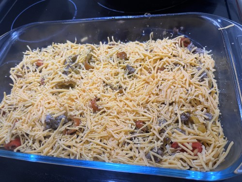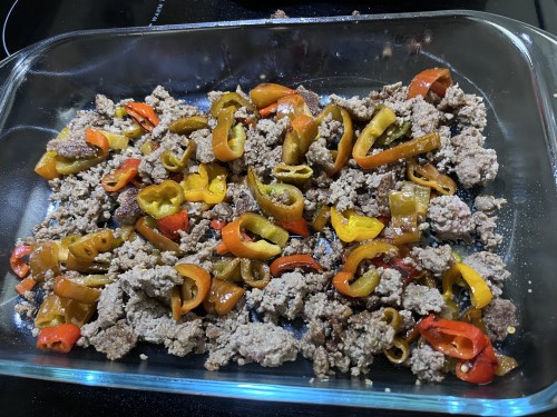 - Layer the bottom of a casserole dish with the sausage and pepper mixture.