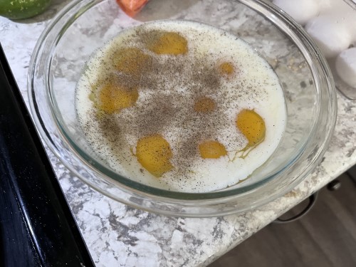 The other layer is the eggs and milk. Whisk together a dozen eggs with milk, salt and pepper.
