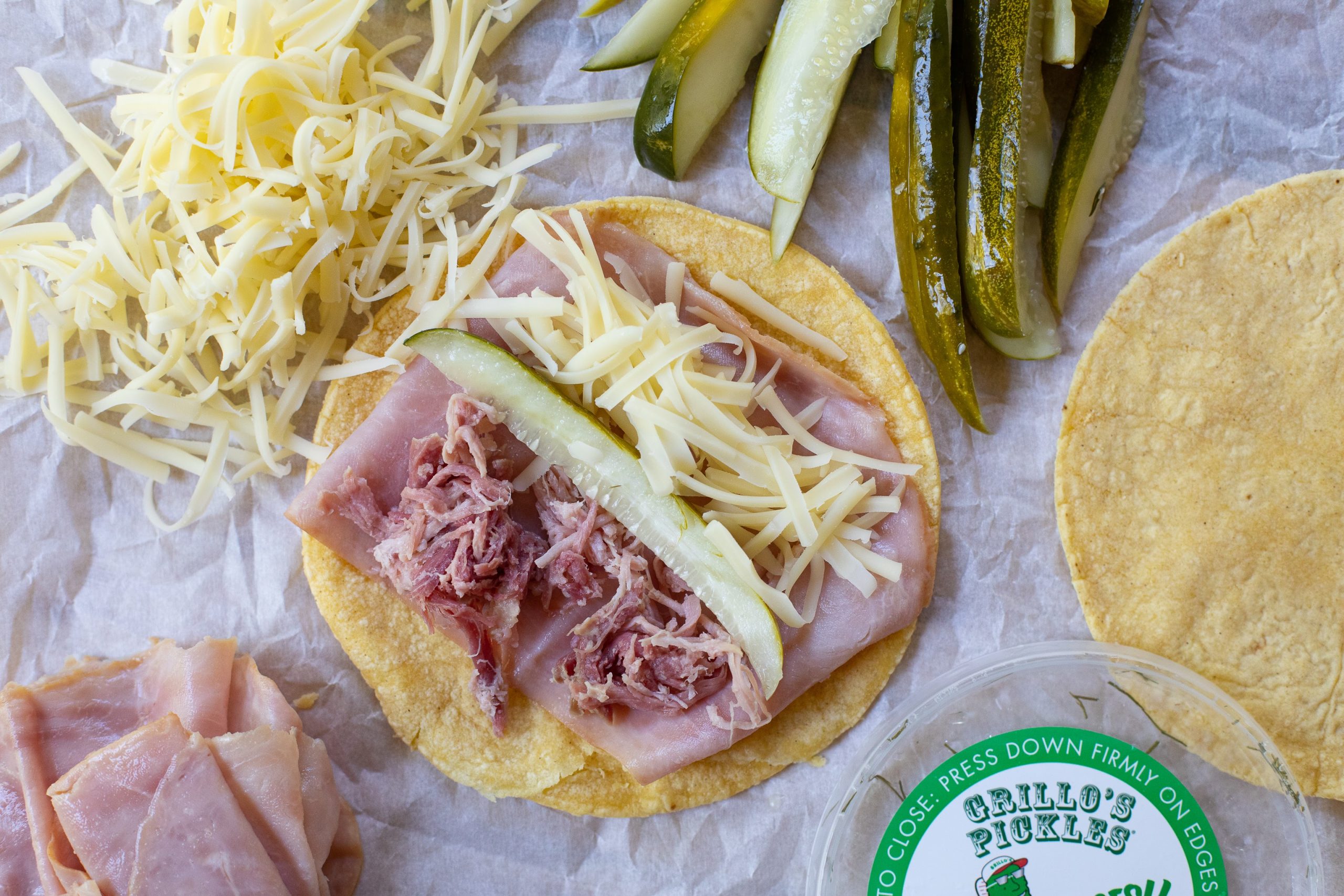 • Divide the ham, cheese and pork and place down the center of each tortilla.