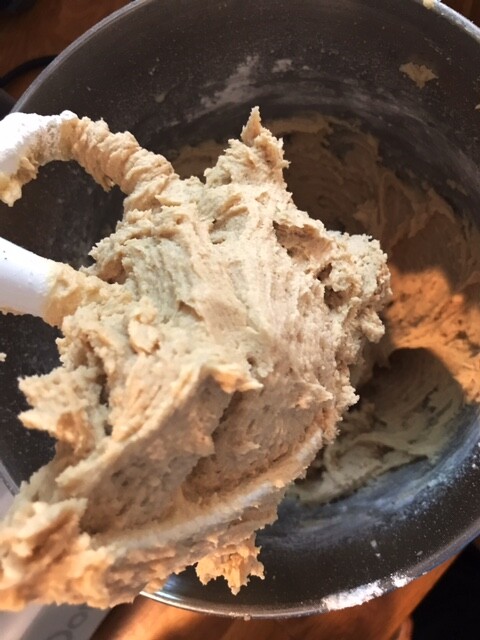 - With the mixer on low, gradually add the flour mixture until the dough just comes together (being careful not to over mix).