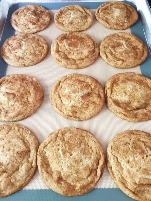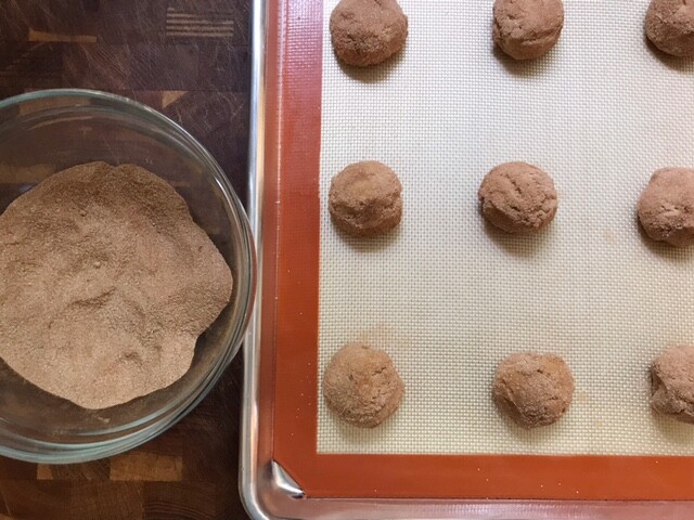 - Roll the cookie dough into tablespoons, roll to coat in the sugar/cinnamon mixture, and add to the cookie sheet, leaving two inches of space around the cookies.