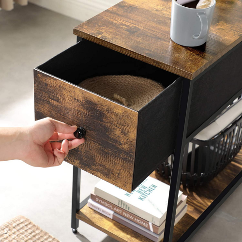- PRACTICAL? ABSOLUTELY: Constructed with a metal frame and engineered wood, this end table can support up to 33.1 lb and the non-woven fabric drawer can hold up to 6.6 lb; plus, the solid wood knob will let you pull out the drawer without any hassle