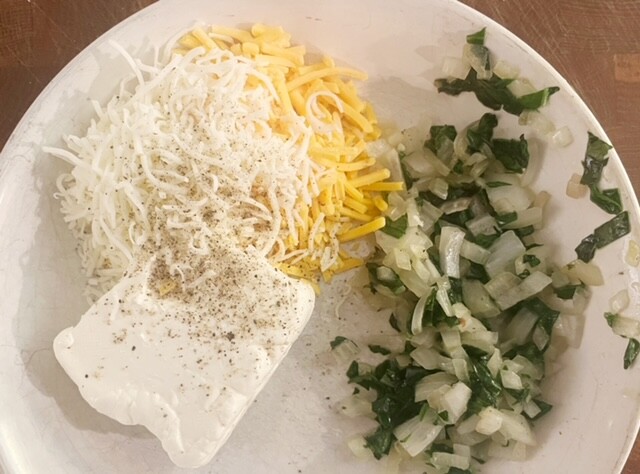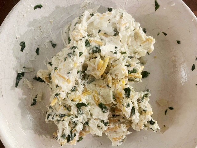 - In a bowl, mix together the cream cheese, shredded cheese, salt and pepper, and reserved veggies. Mix until well combined.