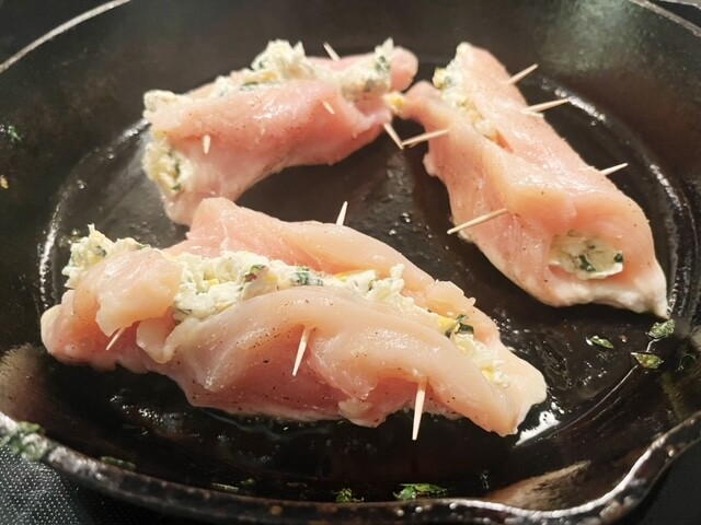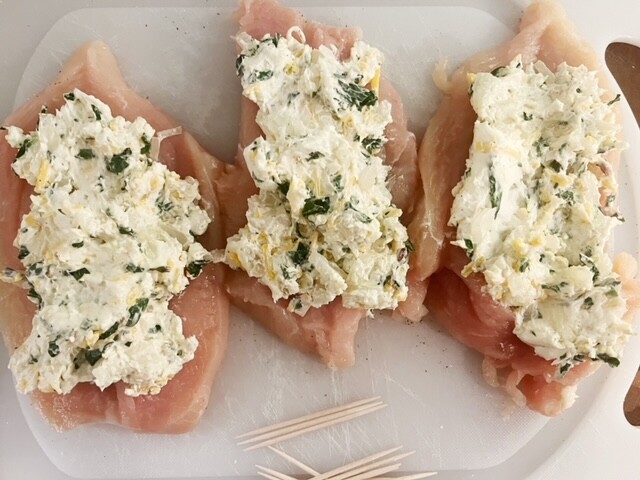 - Butterfly each chicken breast and sprinkle the outside with salt and pepper. Spread the cream cheese mixture over the inside of the chicken breasts and use toothpicks to hold together.
