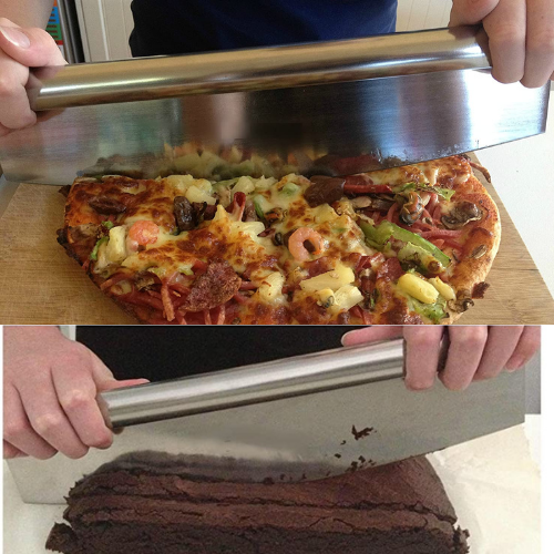 - Save Toppings – Never lose your pepperoni again! Our 14″ x 3.5″ pizza knife cuts rights through your toppings, instead of pushing your pizza toppings off like a roller.