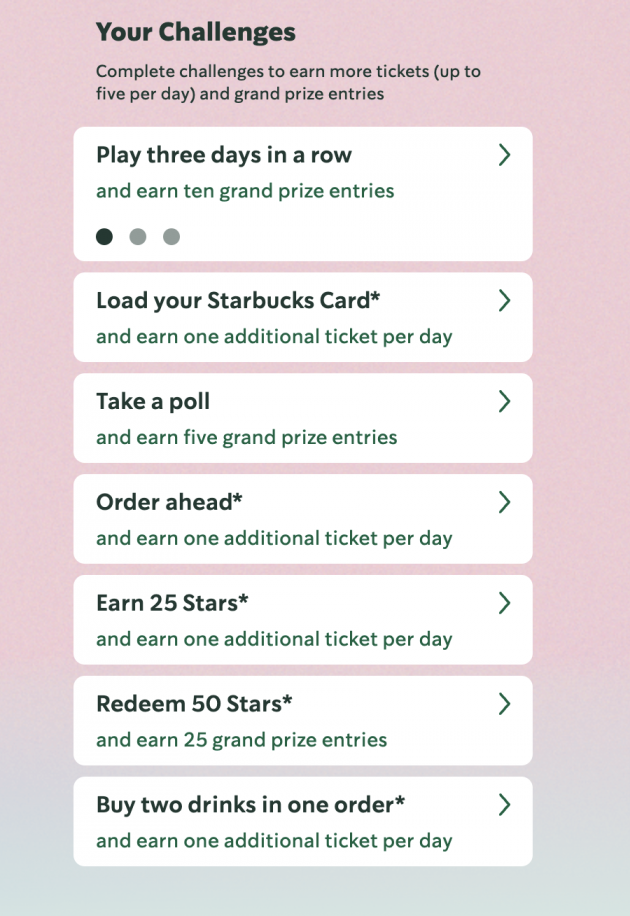 There is a chance to win bonus stars, free drinks, gift cards, and a grand prize of free Starbucks for a year!
