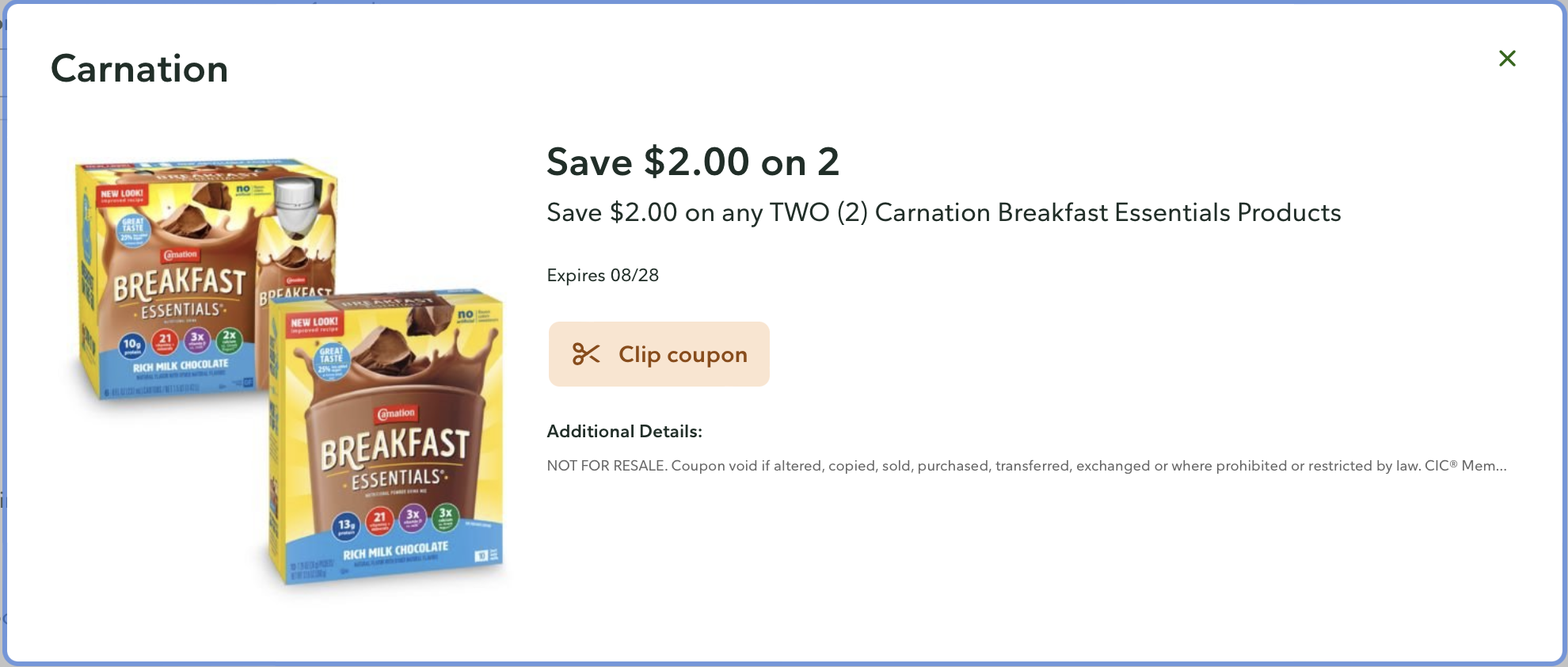 $2/2 Carnation Breakfast Essentials® Product Publix Digital Coupon