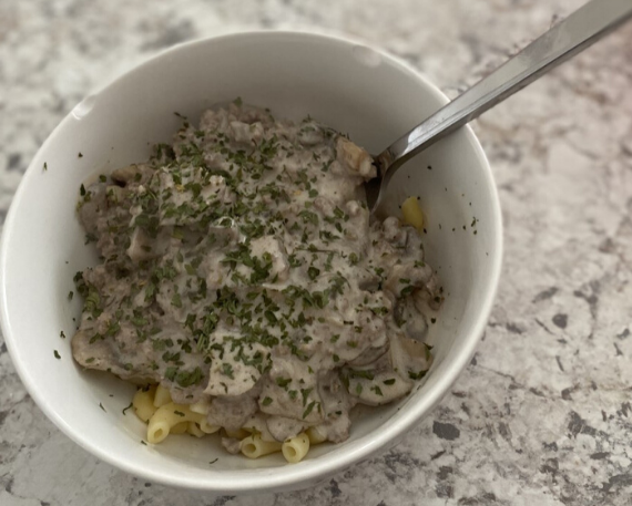 To cook: Thaw freezer bag in refrigerator overnight. Add contents to slow cooker and cook on low for 6-8 hours. In the last 30 minutes of cooking, add the cream cheese (1/2 of 1 block). Stir and break up after 15 minutes and cook for 15 more minutes. Stir in the sour cream (1 cup) and heat through. Serve over egg noodles.