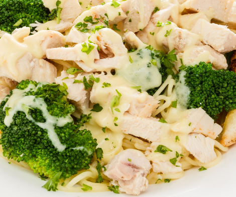 2. Stir in 2 cups of the grated Parmesan and stir continuously until the cheese has melted and everything is smooth. Add the cooked chicken and stir. Add the pasta along with the peas and broccoli and stir until everything is well coated with the sauce and evenly distributed.