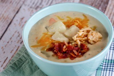 To cook: Thaw freezer bag in refrigerator overnight. Add contents and 6 cups of chicken broth to slow cooker and cook on low for 6-8 hours. Stir in the heavy cream (1 cup) in the last 30 minutes of cooking. Serve with crumbled bacon.