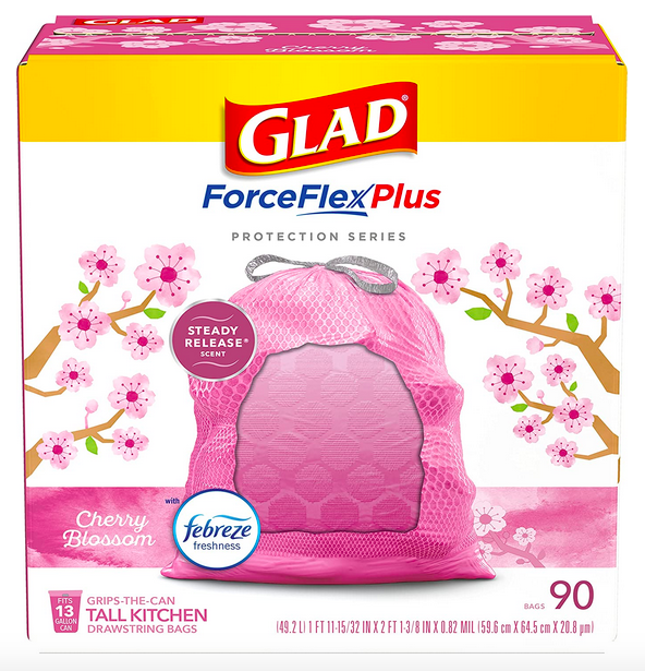 Get this GLAD Protection Series ForceFlex Plus Drawstring Cherry Blossom Odor Shield, Pink, 13 Gallon, 90 Count for just $11.83 shipped when you clip the 15% off e-coupon and checkout through Subscribe & Save!
