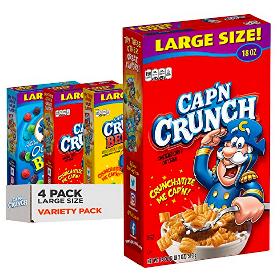 Get this Cap’n Crunch Cereal, 3 Flavor Variety Pack, Large Size Boxes, (4 Pack) for just $11.89 when you clip the 30% off e-coupon!