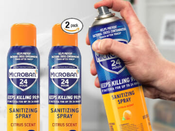 Hop over to Amazon and get a deal on Microban 24 Hour Sanitizing and Antibacterial Spray, 2-Pack (Citrus), 15-Oz. It keeps killing 99.9% of bacteria...2 min