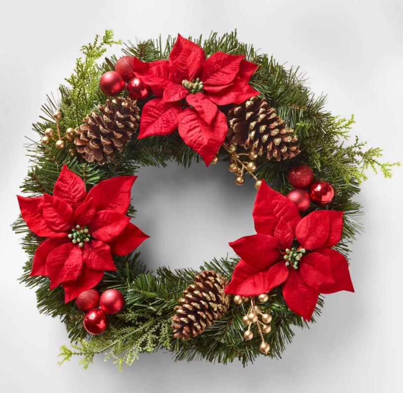 23″ Unlit Poinsettia Berry Pinecone Artificial Wreath, $20