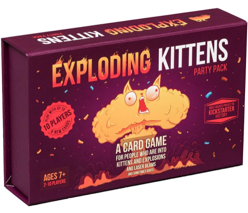 Players take turns drawing cards. If you draw an Exploding Kitten, you lose and you are full of loser sad-sauce. All the other cards in the deck help you avoid or mitigate your risk of drawing an Exploding Kitten. If you don’t explode, YOU WIN! For up to 10 players ages 7 and up. Amazon rating 4 1/2 stars.