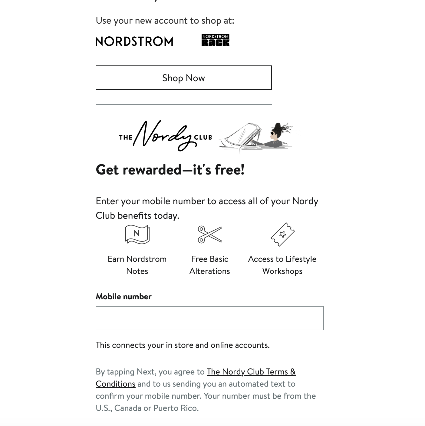 Nordstrom’s Nordy Club is Nordstrom’s free-to-join rewards program. Any United States resident who is 18 or older can join The Nordy Club for free. Sign up for Nordy Club online or in a store by supplying your email address, cell phone number, and first and last name. You don’t have to provide a credit card number, nor do you have to be a Nordstrom credit card or debit card holder to sign up for the Nordy Club.