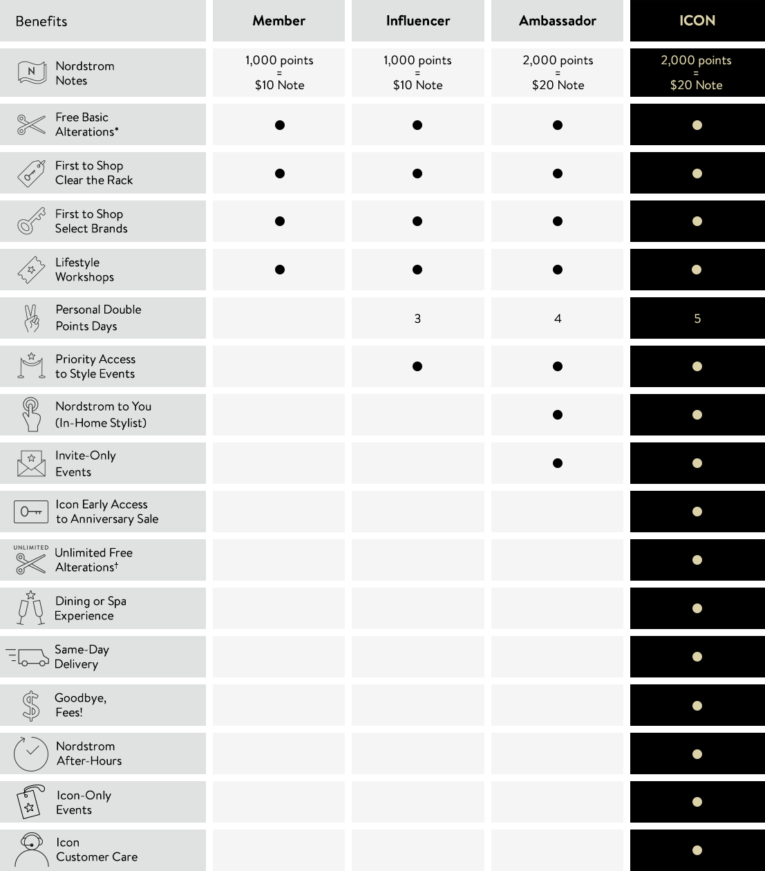 Big spenders who drop $15,000 and have a Nordstrom credit card become Icons. The Icon tier comes with all sorts of fantastic perks, from special Icon-only events, dining and spa experiences, unlimited free alterations, same-day delivery in New York City and no Nordstrom credit card fees.