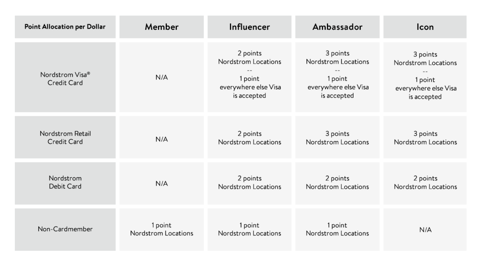 Members earn one point for each $1 spent at Nordstrom while Nordstrom credit and debit card holders earn two points for every $1 spent. There are occasional promotional events where you can temporarily earn more points for each $1 spent.