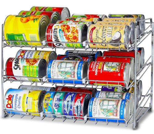 Start out by buying a little extra each time you go to the grocery store. Instead of buying 3 cans of green beans, buy 6, buy 4 cans of tuna instead of 2, and so on. Before you know it, you will have several weeks’ worth of the food you use regularly. One thing to keep in mind is to make sure and rotate your food. By putting your new cans in the back, your old ones will get used first. Your extra storage doesn’t help if it is all expired. There are some great products out to make this easier. Can organizers automatically rotate your food. Tiered shelves help you to see what you have.