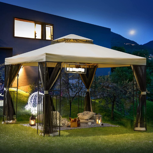 • DOUBLE ROOF: The design of this outdoor gazebo is double top with netting which helps air circulation and to hold up in wind better. The double-tiered polyester roof features keep everyone cool in the shade.