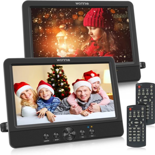 - 2 X10.5 ” Car DVD Player-WONNIE new generation 10.5 inch Two DVD players with HD resolution 1024×800, can play two different movies. A same movie will play simultaneously, only connect AV cable, press SOURCE on slave player and choose AV IN