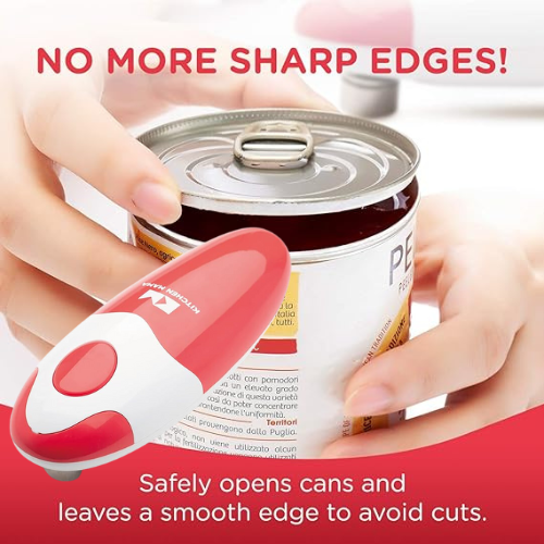 • Easy operation-Two taps to open any cans with this electric can opener. Push the button to turn it on. It cuts cans 360° along the lid. Push the button again to stop — EASY!