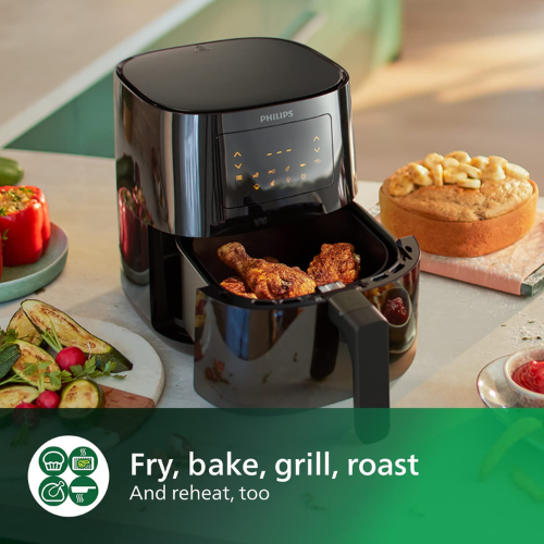 • The air fryer can do more than just fry; it also grills, roasts, bakes and even reheats. The digital touch screen comes with 7 presets to make it easy to decide which temperature is best to cook your food and a keep warm function makes sure your food is ready when you are. Cook up to 4 portions (1.8lb/ 4.1L capacity) of food at once.