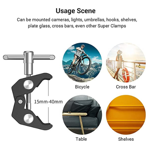- VERSATILITY – The super clamp is designed to mount onto anything like cameras, lights, umbrellas, hooks, shelves, plate glass, cross bars, even other Super Clamps. It’s up to your imagination & inventive ideas.