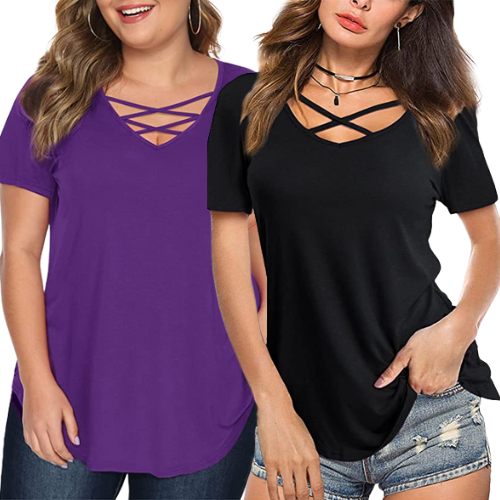 - Short sleeve shirts with v neck, front criss cross, curved hem, super chic and fashionable.