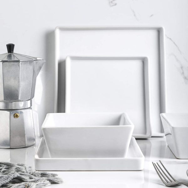 - Material: Stoneware – Stoneware has an earthy, organic feel. These plate, bowl, cup dish sets bring to mind rustic elegance to the table.
