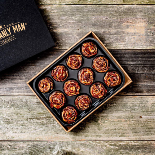 Bouquet of one dozen stemless, old-fashioned maple candied bacon roses dipped in dark chocolate to form a dessert cup bottom that slides out of a custom-branded box to ensure the best gifting experience possible.